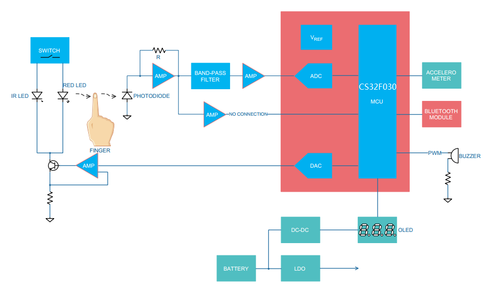 從以上這種較為典型的血氧儀方案來看,核心毫無疑問就是MCU,其內(nèi)部集成了ADC和DAC以完成數(shù)模信號間轉(zhuǎn)換。外圍則是放大器、帶通濾波器等模擬電路,作用就是向MCU傳輸處理過的信號。除了這些計算電路,負(fù)責(zé)向指尖照射紅光和紅外光的兩個LED也必不可少。通過計算還原血紅蛋白和有氧合血紅蛋白對這兩種光線吸收的差額,即可推算出血氧飽和度數(shù)值。